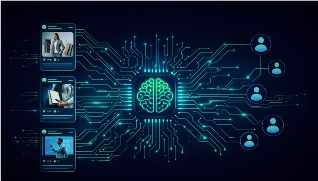 Agora, o sistema identifica o anúncio através de um Entity ID — uma classificação baseada no padrão visual e auditivo do criativo, e não apenas no arquivo enviado. Isso significa que o seu anúncio é quem faz o trabalho de segmentação. O algoritmo analisa o comportamento recente do usuário (ex: assistiu a Reels sobre café, leu comentários sobre máquinas de espresso) e usa o Entity ID para prever a probabilidade de conversão imediata.